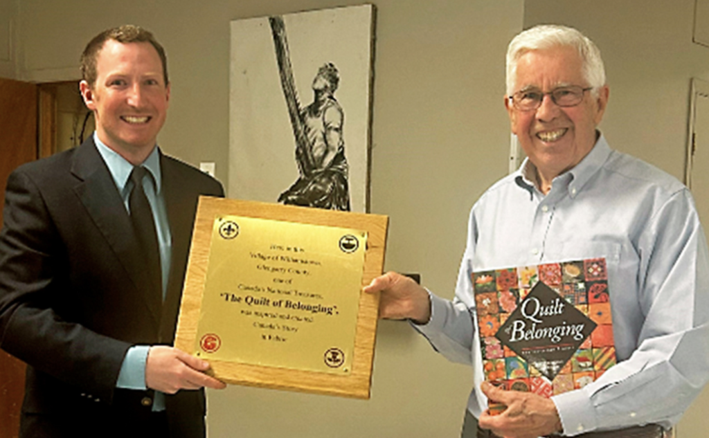John Towndrow (right) presents a plaque to Mayor Lachlan McDonald to commemorate South Glengarry’s support of the Quilt of Belonging.